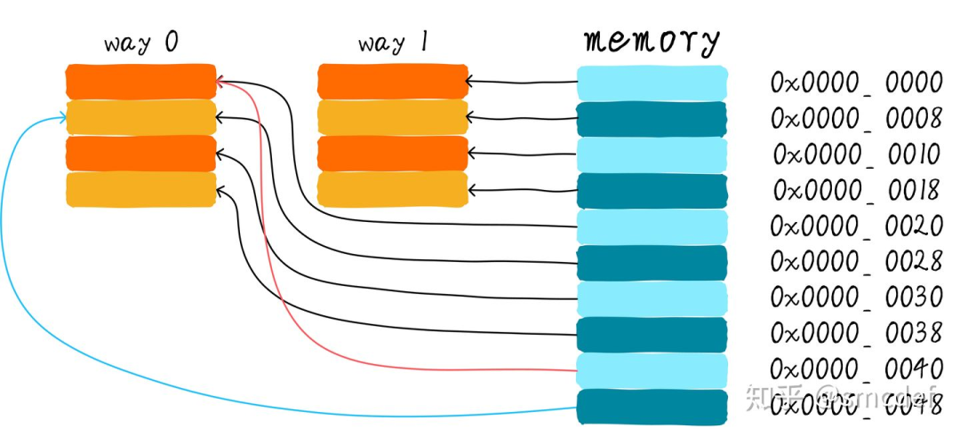 我们可以看到,地址0x00-0x3f地址处对应的数据可以覆盖整个cache。0x40-0x7f地址的数据也同样是覆盖整个cache。我们现在思考一个问题,如果一个程序试图依次访问地址0x00、0x40、0x80,cache中的数据会发生什么呢?首先我们应该明白0x00、0x40、0x80地址中index部分是一样的。因此,这3个地址对应的cache line是同一个。所以,当我们访问0x00地址时,cache会缺失,然后数据会从主存中加载到cache中第0行cache line。当我们访问0x40地址时,依然索引到cache中第0行cache line,由于此时cache line中存储的是地址0x00地址对应的数据,所以此时依然会cache缺失。然后从主存中加载0x40地址数据到第一行cache line中。同理,继续访问0x80地址,依然会cache缺失。这就相当于每次访问数据都要从主存中读取,所以cache的存在并没有对性能有什么提升。访问0x40地址时,就会把0x00地址缓存的数据替换。这种现象叫做cache颠簸(cache thrashing)。针对这个问题,我们引入多路组相连缓存。我们首先研究下最简单的两路组相连缓存的工作原理。