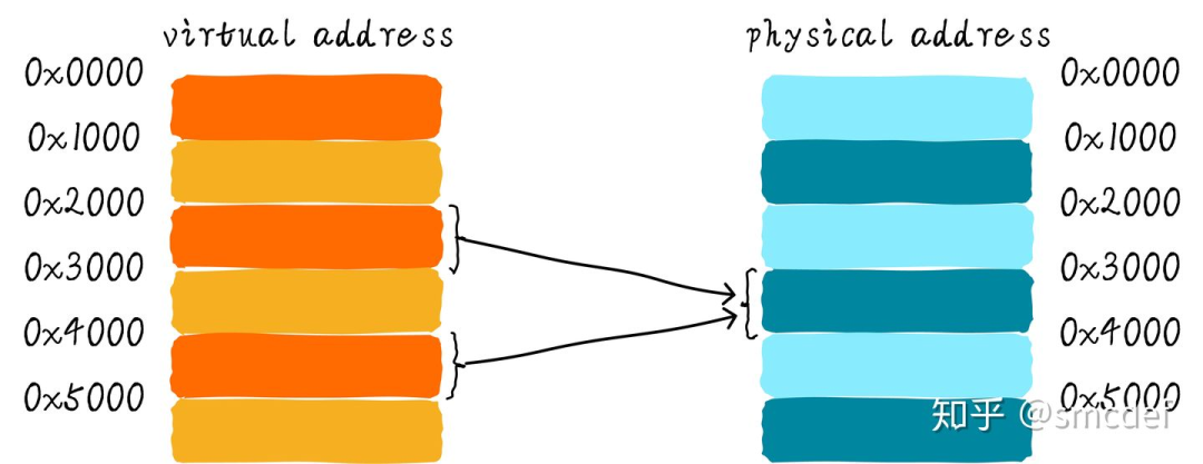 我们接着上面的例子说明。首先出现问题的场景是共享映射,也就是多个虚拟地址映射同一个物理地址才可能出现问题。我们需要想办法避免相同的物理地址数据加载到不同的cacheline中。如何做到呢?那我们就避免上个例子中0x1000映射0x4000的情况发生。我们可以将虚拟地址0x2000映射到物理地址0x4000,而不是用虚拟地址0x1000。0x2000对应第0x00行cacheline,这样就避免了别名现象出现。因此,在建立共享映射的时候,返回的虚拟地址都是按照cache大小对齐的地址,这样就没问题了。如果是多路组相连高速缓存的话,返回的虚拟地址必须是满足一路cache大小对齐。在Linux的实现中,就是通过这种方法解决别名问题。