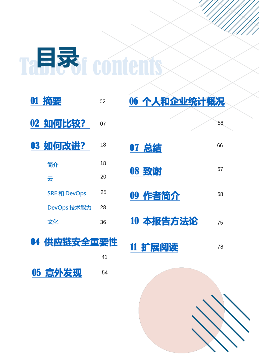 在过去的 8 年里,我们撰写了 加速: DevOps 状态报告(Accelerate State of DevOps report),其间听取了大约 33,000 名专业人士的意见。我们的研究重点在于审 视那些预测 DevOps 核心产出的能力和实 践,包括下列几个方面:- 软件交付效能(Software delivery performance)——软件交付效能的四个 关键指标:部署频率、变更前置时间、变 更失败率和服务恢复时间;