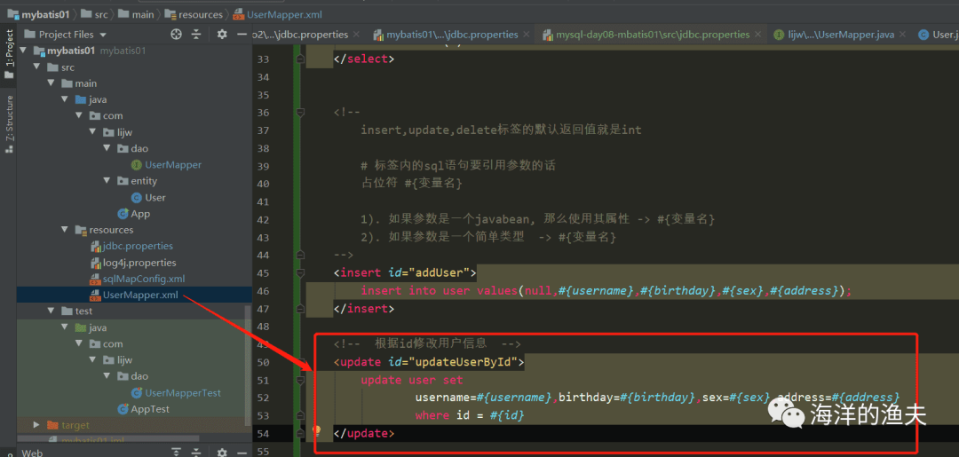 1). 如果参数是一个javabean, 那么使用其属性 -> #{变量名}