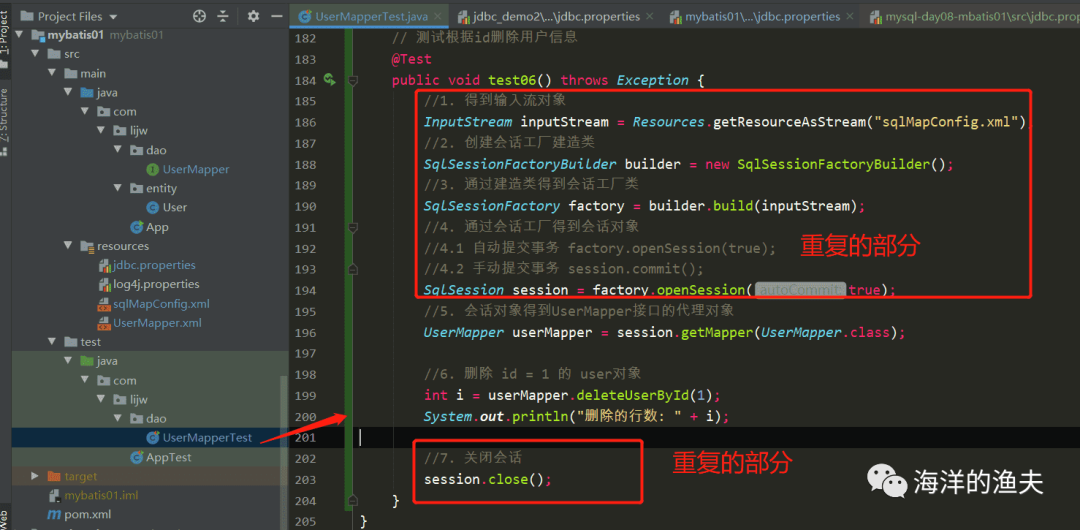 下面我们可以将重复的部分抽为一个工具类。另外,我们在结束的时候还可以设置手动提交事务,以及事务的回滚操作。