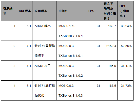从表格中可以看到,AIX从6.1升级到7.1(应用程序进行了重新编译)后,场景2和场景1对比,CPU利用率飙升(52.55-38.24)/ 38.24%=37%。这是非常吃惊的结果。