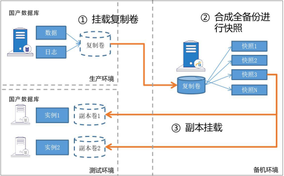 而具体实现的功能,如备份领域还是包括诸如备份策略、传输压缩、加密、重删、归档、远程复制等基础功能,以及永久增量备份,快速挂载恢复等。如下所示英方针对数据库备份的架构图,在数据文件复制至备份服务器后,首先需要进行备份数据的合并,随后生成数据快照,在生产数据发生故障后,可通过快照克隆出副本后以挂载方式实现即时恢复。
