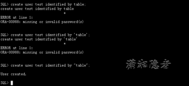 创建账号或修改账号密码时有可能会遇到ORA-00988: missing or invalid password(s)这个错误,那么什么情况下会遇到这种错误呢?一般是因为密码的设置不符合规范: