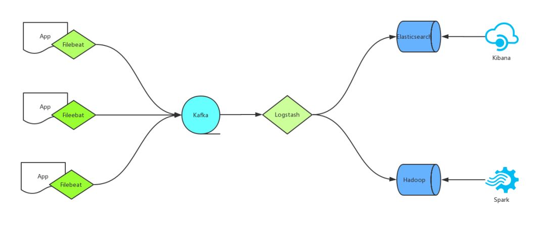 所有日志由Rsyslog或者Filebeat收集,然后传输给Kafka,Logstash作为Consumer消费Kafka里边的数据,分别写入Elasticsearch和Hadoop,最后使用Kibana输出到web端供相关人员查看,或者是由Spark接手进入更深层次的分析