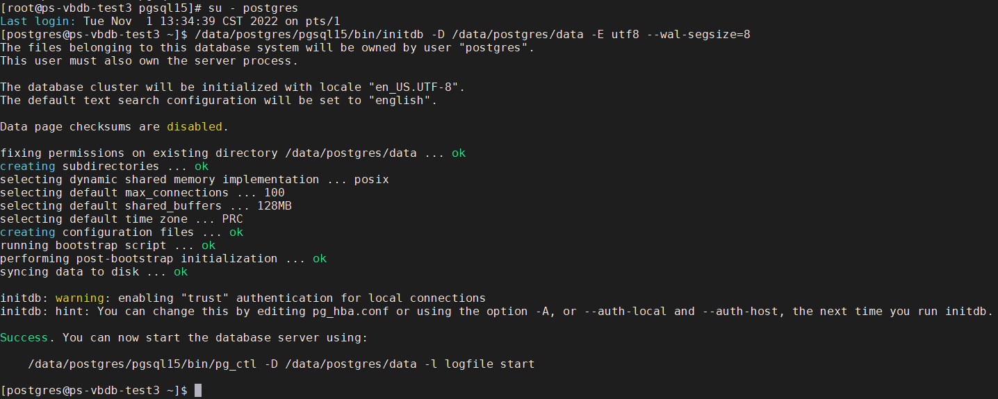 A)初始化数据:/data/postgres/pgsql15/bin/initdb -D /data/postgres/data -E utf8 --wal-segsize=8