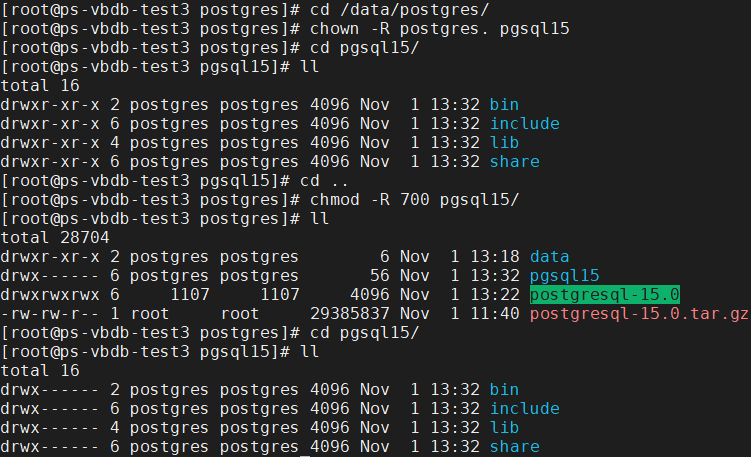 chown -R postgres. {/data/postgres/pgsql15,/data/postgres/data}