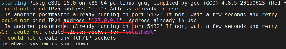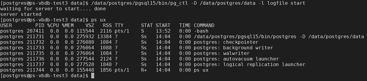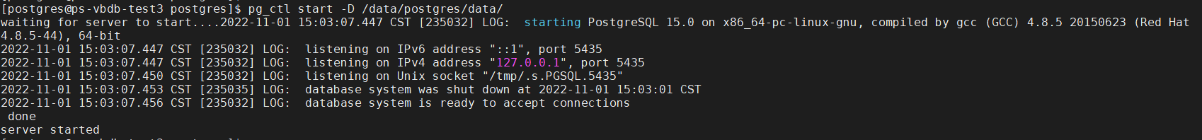 启动数据库:/data/postgres/pgsql15/bin/pg_ctl -D /data/postgres/data -l logfile start