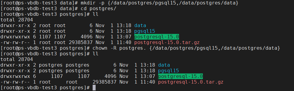 mkdir -p {/data/postgres/pgsql15,/data/postgres/data}