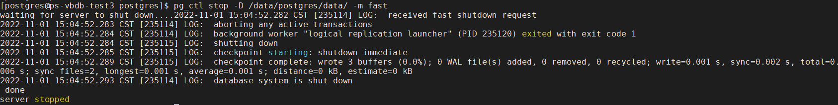 停止数据库:pg_ctl stop [-D datadir] [-m s[mart] | f[ast] | i[mmediate] ] [-W] [-t seconds] [-s]