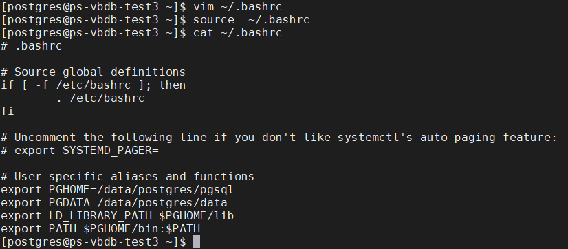 切换到数据库用户postgres,在.bashrc文件中添加以下内容后source环境变量 source .bashrc