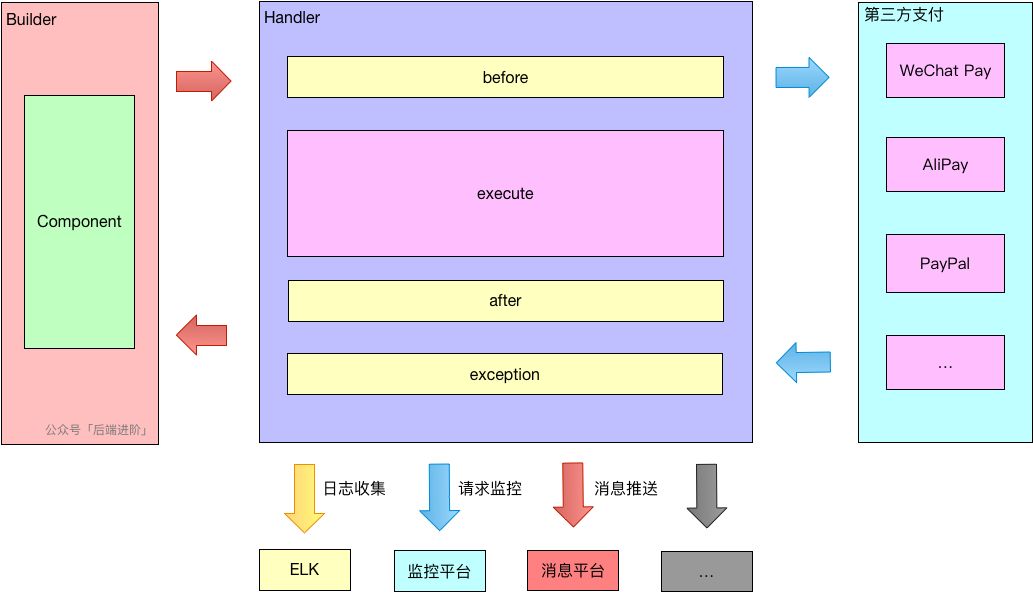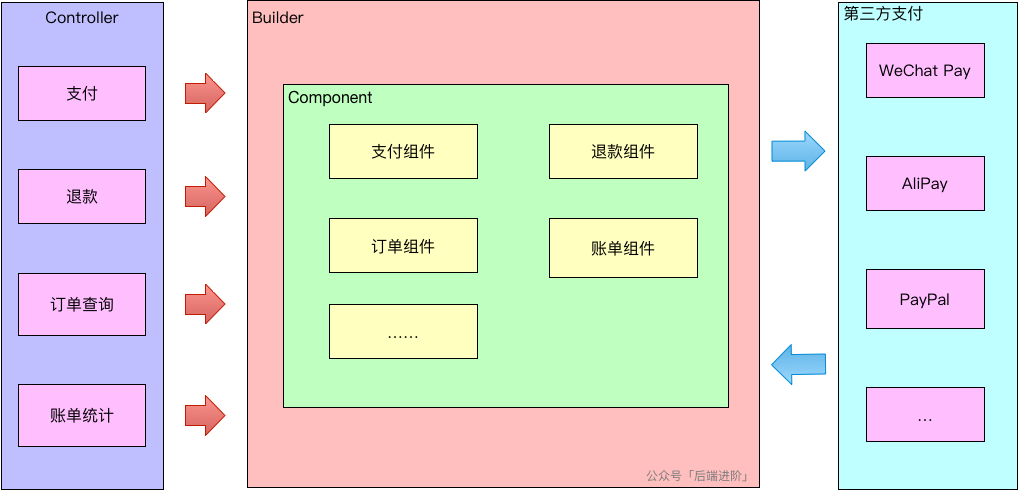 通过 Builder 模式根据请求参数构建对应的组件对象,将组件与外部分离,隐藏组件构建的实现。组件模式+Builder 模式使得支付平台具备了高扩展性。