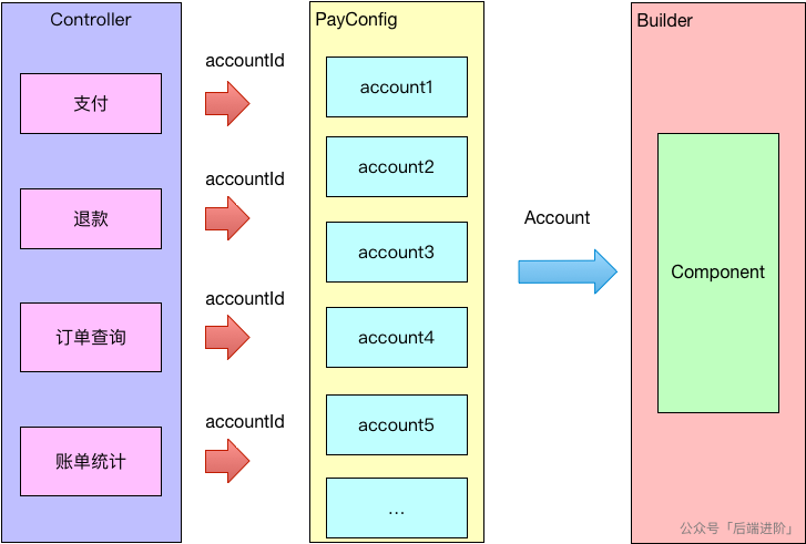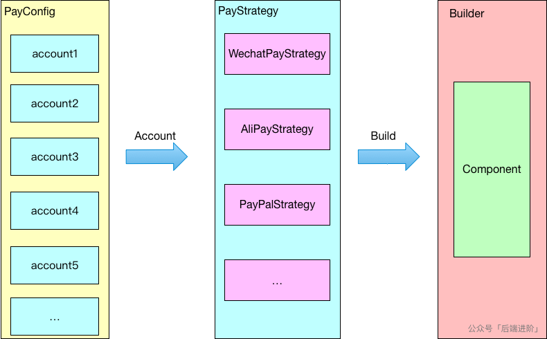 然后通过 Builder 模式构建支付账户对应的组件对象,完全屏蔽不同支付之间的差异。