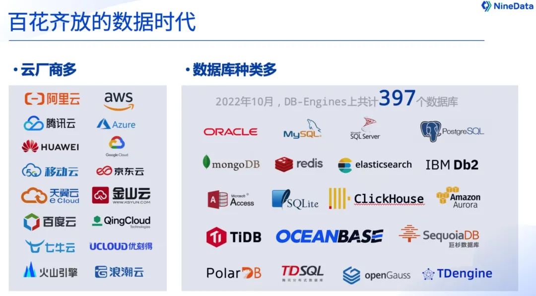 从市场调查统计,大型云厂商已经超过 30 家,对外发行的数据库有 397 种。