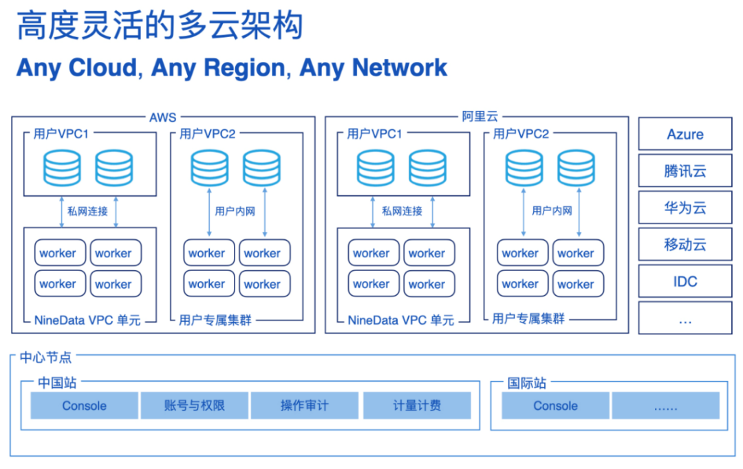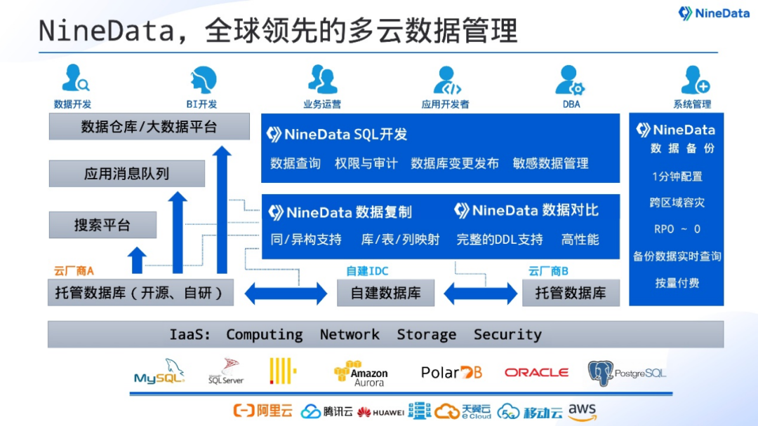 NineData 会支持主流的云厂商和自建机房,也就是说,无论是云上还是云下的数据库,也不论是云⼚商专属数据库还是自建数据库,NineData 都会⽀持。