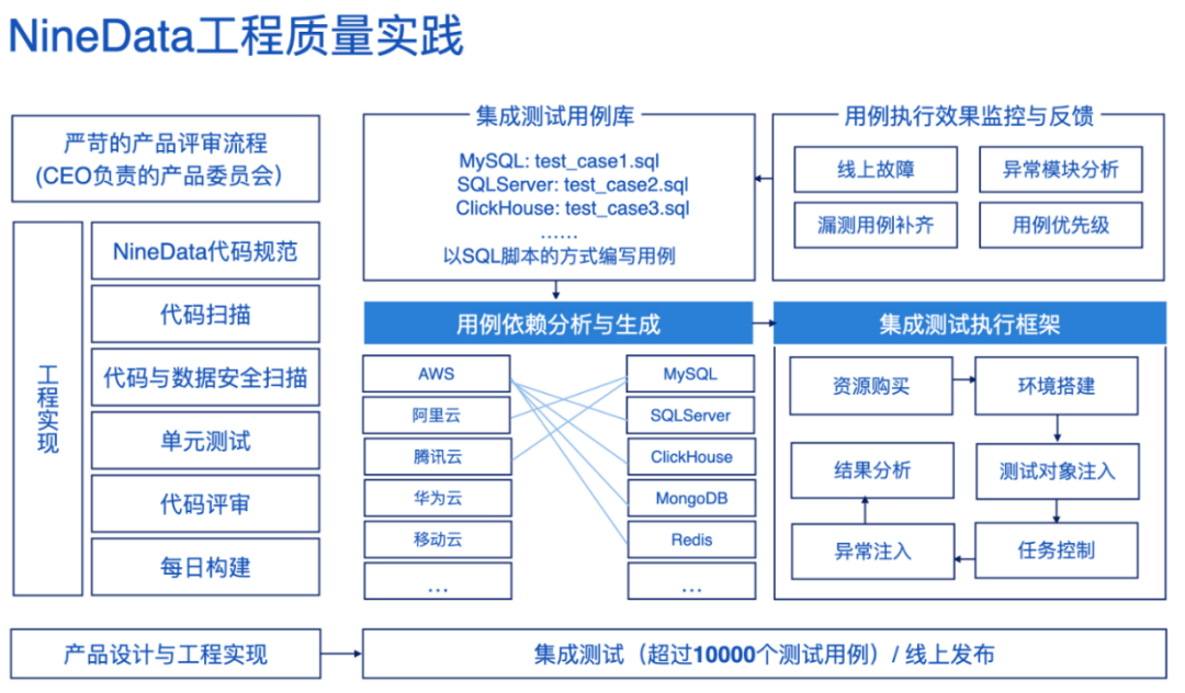 此外,NineData 要解决的重要问题是大规模集成测试,NineData 要支持这么多云厂商和数据源,每修改或新增一个功能,就需要在所有支持的云、数据源上进行测试,这个成本非常高,所以我们实现了一个自动化测试框架来完成这些工作。首先能够低成本、无需编码来写用例,团队所有同学都可以不断沉淀,这是保证工程质量的基础,我们很快就积累超过一万个用例。其次是能自动化的执行用例,框架会自动分析依赖,比如 MySQL 相关的用例会搭建 MySQL 所有版本作为源,然后再根据 NineData 的支持范围选择目标。新增的数据源都会自动继承庞大的用例库。最后结合用例执行情况与线上故障等要素,制定优先级与补齐漏测场景。通过这些工作,NineData 可以快速积累测试场景和发现问题,确保我们提供的服务安全稳定。