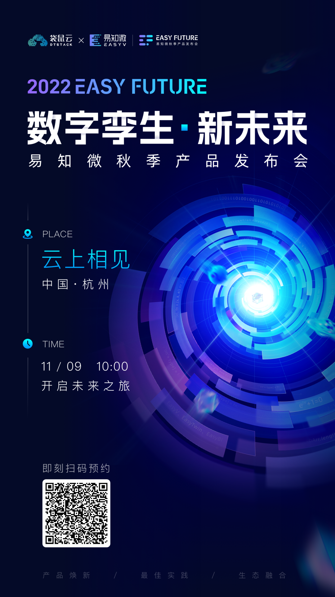 作为领先的全链路数字化技术与服务提供商,袋鼠云基于长期价值出发,于2021年5月投资成立了子公司易知微,深耕数字孪生产业生态,致力于“让每一个组织和个体都看见并受益于数字化”。2022年11月9日,易知微将举办在线发布会,包括自研数字孪生渲染引擎EasyTwin、可视化SaaS平台EasyV6.0,以及数据治理和数字孪生行业最佳实践等,将正式和大家见面,开启数字孪生新未来,敬请期待!