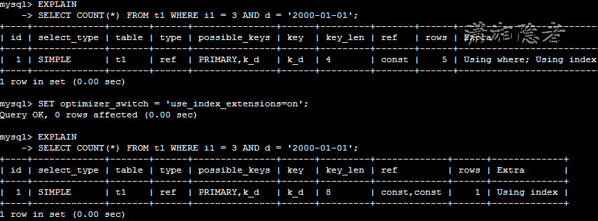 #默认情况下,索引扩展(use_index_extensions)选项是开启的。可以在当前会话通过修改优化器开关optimizer_switch开启、关闭此选项。