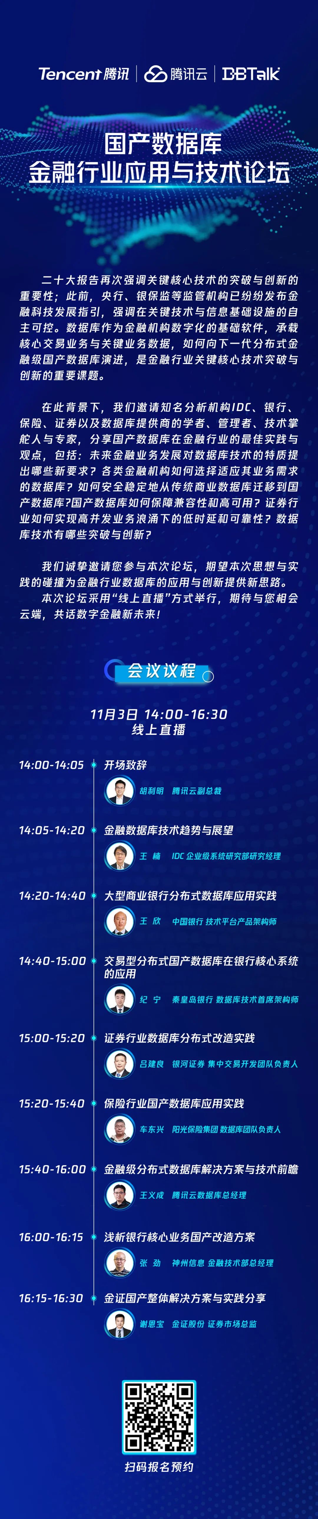 11月3日14:00~16:30,腾讯云数据库DBTalk直播间邀请IDC分析师,大型商业银行(中国银行)、城商行(秦皇岛银行)、证券(银河证券)、保险(阳光保险)各行业数据库团队业务或技术负责人、腾讯云副总裁、腾讯云数据库总经理及神州信息金融技术部总经理、金证股份证券市场总监等众多金融行业大咖,一起剖析国产数据库在金融行业应用的最新成果、经验与突破。诚挚邀请您参与本次直播,共话数字金融新未来!