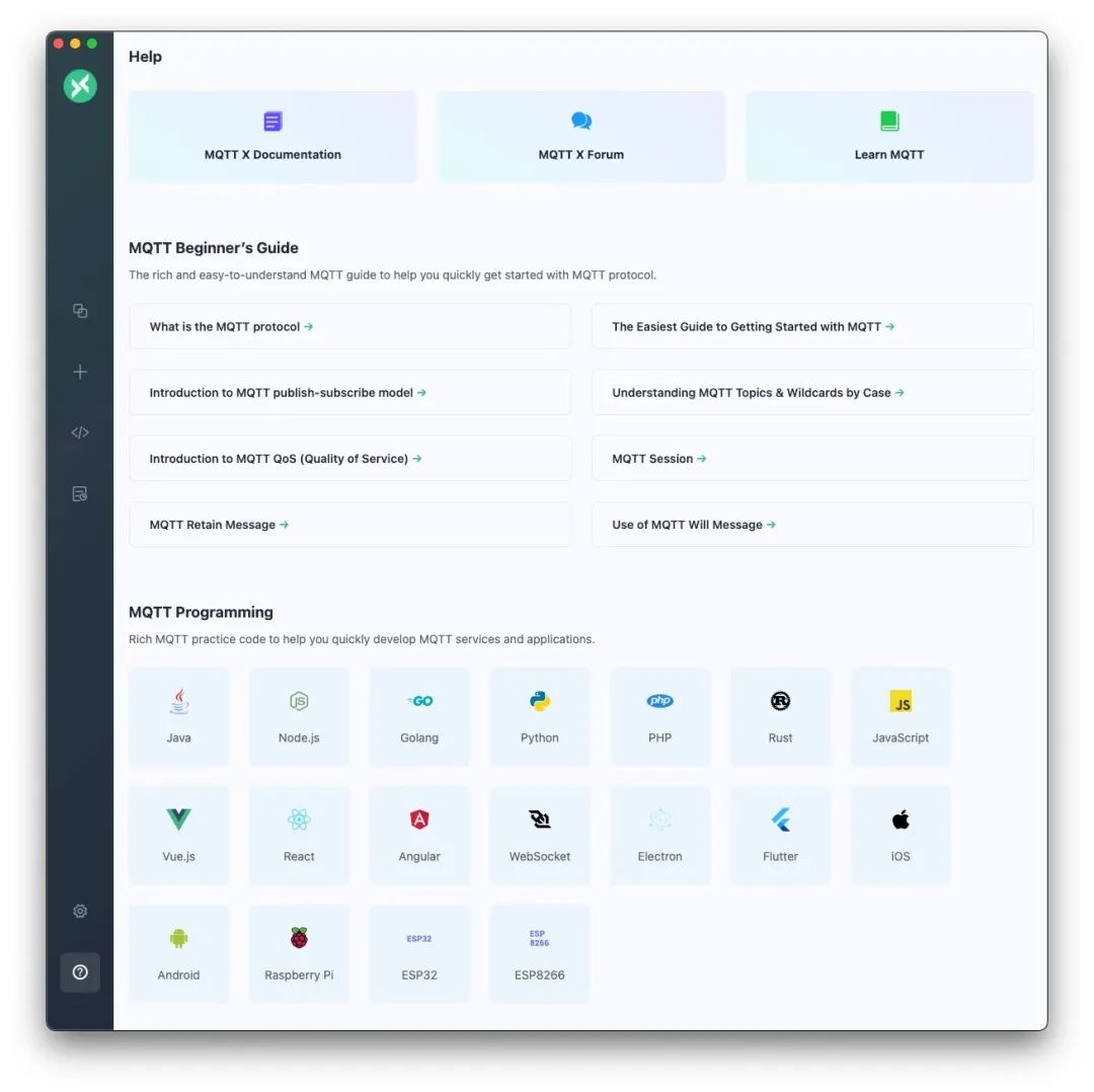 因此 MQTT X 除提供了简单高效的连接、发布和订阅等功能测试能力外,在目前正在开发的 1.9.0 版本中,还新增了一个帮助页面。该页面不仅提供了查看和使用 MQTT X 的文档链接,还提供了 MQTT 基础入门系列与实践编程系列的内容模块,帮助一些正在学习或初次接触到 MQTT 的用户快速了解 MQTT 协议,理解协议中的各项配置参数和使用方法,查看其使用场景与案例。
