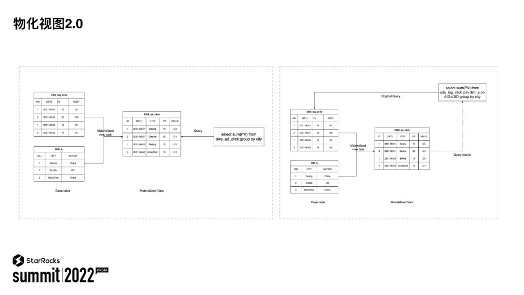 图右展示的是 StarRocks 能够将用户对原表的查询自动改写为对物化视图的查询。这里的物化视图起到的是一个透明加速的能力。