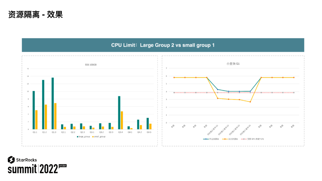 图左可以看出,两个资源组运行同样的请求的情况下,大资源组运行更快,并且从执行效率上看是符合所获得资源比例的。图右展示的是当查询运行在大资源组时,开启资源隔离与关闭资源隔离时执行效率的对比图。可以看到,当开启资源隔离后,大资源组里面执行的效率与理论计算效率较相符。通过上面这两个 case 可以看出 StarRocks 当前资源隔离的效果,我也期待资源隔离能够给更多用户带来价值。
