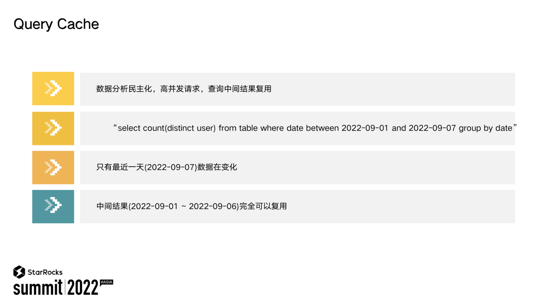 比如下面这个查询要计算过去 7 天每天的 UV 值,但其实只有最近一天的数据在变更,其他 6 天的数据并没有更新。实际上过去 6 天的数据查询结果是能够被复用的。如果能够复用之前的查询结果,那查询就会执行得更快。所以很自然想到,我们可以针对这样的查询场景设计中间结果 cache 加速查询。