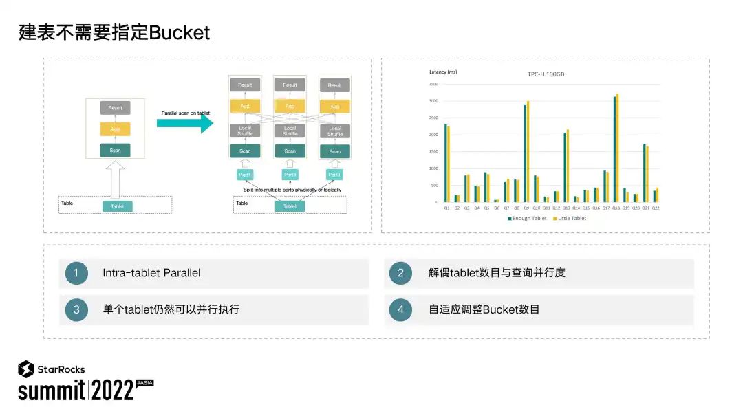所以用户就会问,那么我到底应该设置成多少呢?为了解决用户的这个困扰,让用户能够更简单地使用 StarRocks,我们做了以下两方面的工作:首先是解耦 tablet 与执行并行度之间的关系。我们通过支持 local shuffle 这样的能力,使得查询并行度与 tablet 数目之间无关。即使只有一个 tablet,上层仍然可以并行执行查询。之前 StarRocks 一个 tablet 上层只能有一个并行路来执行,但新版本的 StarRocks 可以不受 tablet 数目的限制。虽然只有一个 tablet,上层仍然可以并行的执行。