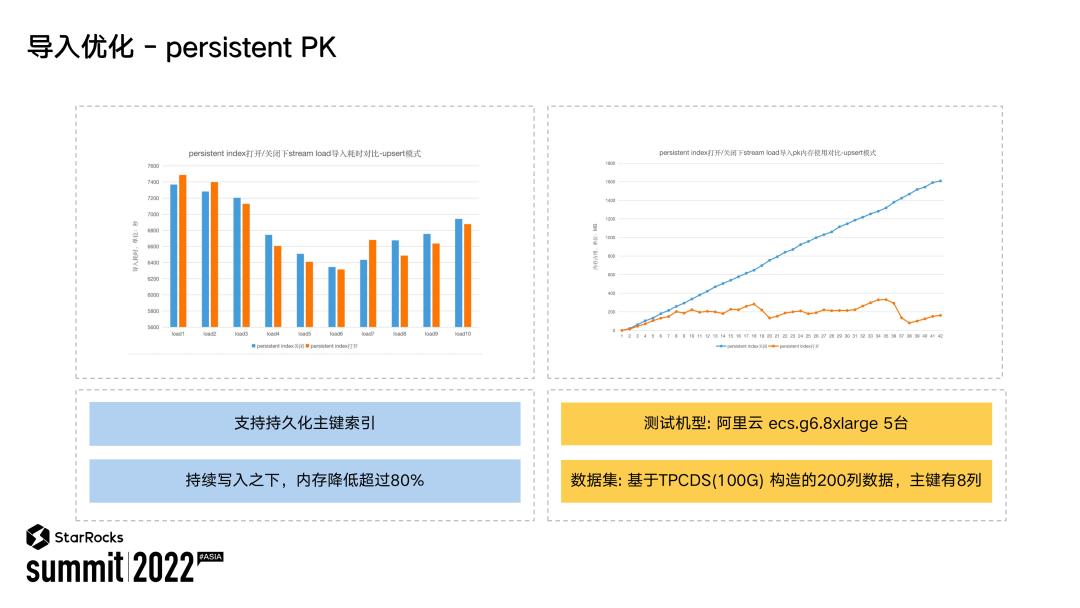 从上图中也可以看到,在开启了 persistent PK 时,导入性能基本上没有什么影响,但系统占用的内存比例下降了 80%。