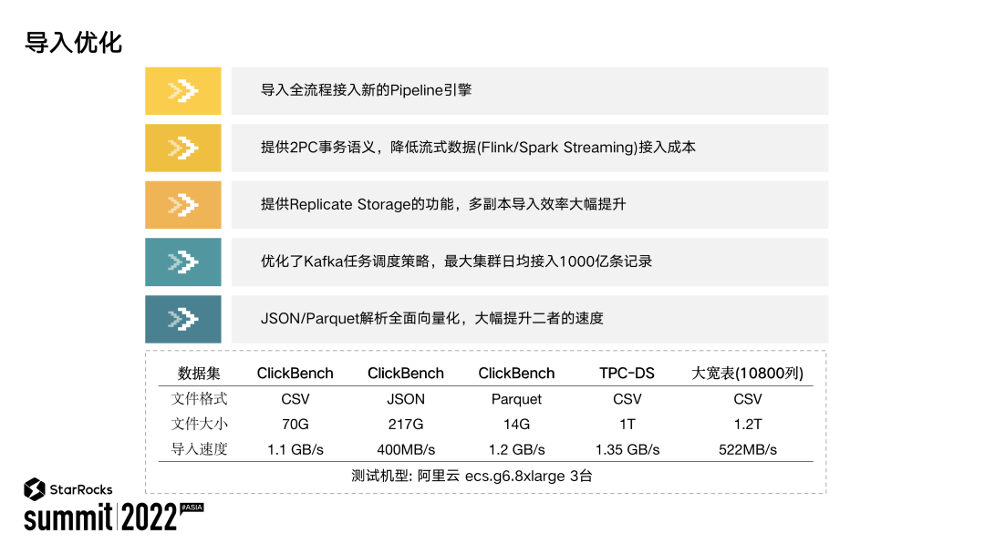 除了在 Primary Key 模型的优化之外,我们还做了很多导入优化。将导入全流程接入了我们 Pipeline 引擎,提供了 2PC 导入事务语义,支持了 Replicate Storage,能够极大提升多副本导入的速率,优化了 Apache Kafka 导入的调度策略。当前最大规模已经支持了 1000 亿/天的导入速度,实现了全面向量化解析 JSON/Parquet,提升两者的导入速度。