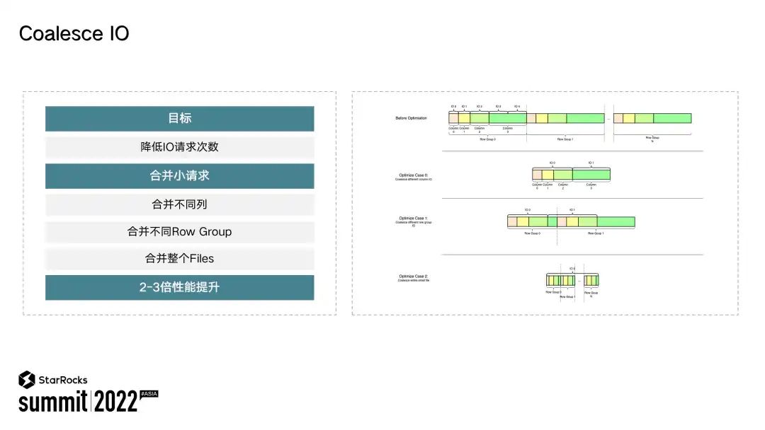 针对湖上单次 IO 请求延时比较高的情况,为了能够让分析执行地更迅速,StarRocks 支持了 Coalesce IO用于合并小的 IO 请求,通过减少 IO 次数,增加每次 IO 的请求量,这样就能够提升整个查询时延。