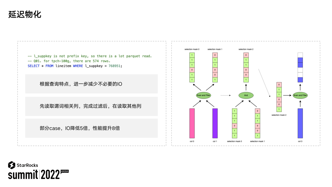 Coalesce IO 是根据文件的物理属性进行 IO 优化,那么延迟物化是根据查询请求的特征来进行优化,其目的仍然是减少 IO 的请求次数。像上图中第三行,这样一条 SQL 指令会扫描表中所有的列,但是有一个选择度超低的过滤条件,在正常的执行逻辑过程中会将所有的列先扫描出来,然后完成谓词过滤。这样基本上是一个全标扫描的操作,会有大量的 IO 请求。