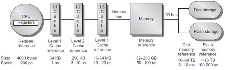 软件开发人员往往期望计算机硬件拥有无限容量、零访问延迟、无限带宽以及便宜的内存,但是现实却是内存容量越大,相应的访问时间越长;内存访问速度越快,价格也更贵;带宽越大,价格越贵。为了解决大容量、高速度、低成本之间的矛盾,基于程序访问的局部性原理,将更常用数据放在小容量的高速存储器中,多种速度不同的存储器分层级联,协调工作。