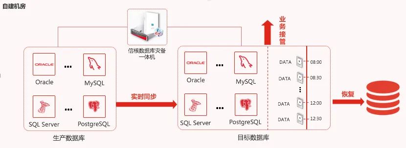在本地自建机房,以旁路方式将信核灾备一体机嵌入数据库业务系统,对核心数据库进行实时同步复制及CDP快照保护,避免本地数据库受到网络攻击、软硬件故障等意外情况导致业务受损,提高可靠性。