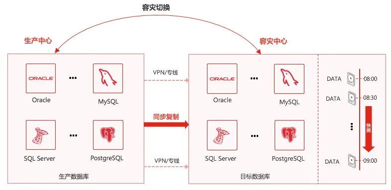 当生产中心数据库数据面临丢失或损坏,可切换至容灾中心数据库为前端应用继续提供数据库服务。