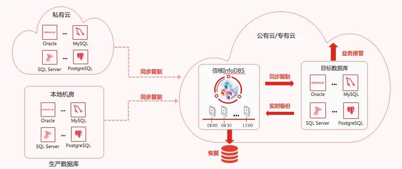 信核InfoDBS可部署在公有云/专有云上,可对本地机房、私有云、混合云架构下的各种数据库进行统一上云备份,提高数据库安全可靠性及高效恢复。