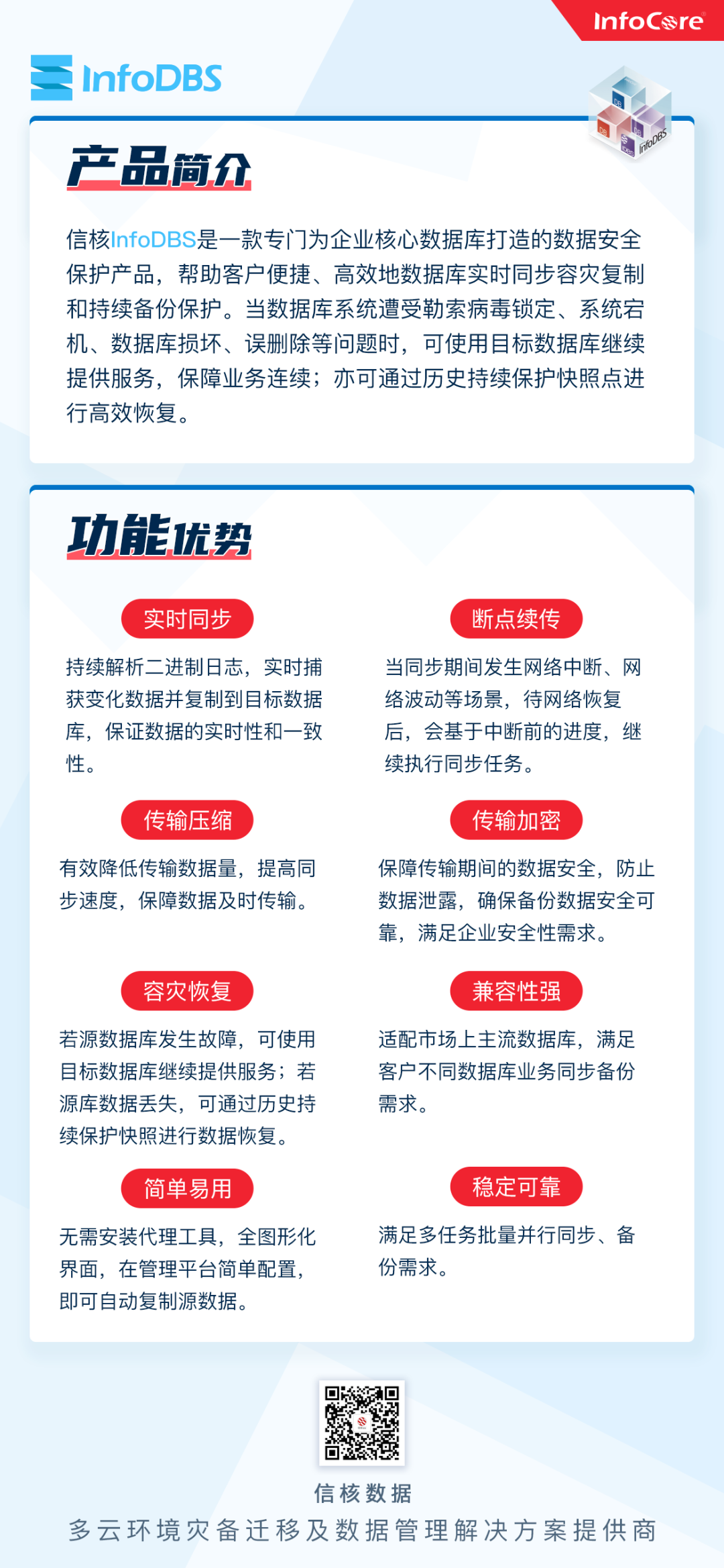 信核InfoDBS是一款专为企业核心数据库打造的数据保护产品,可为用户提供便捷、高效的数据库实时同步复制和备份保护解决方案。