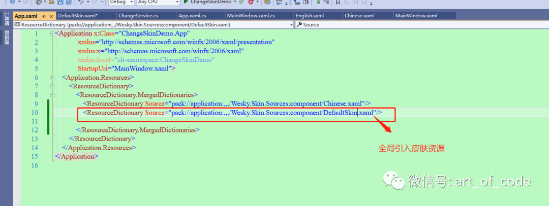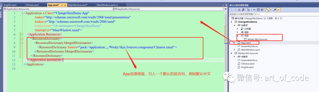 9、App.xaml文件内,引入资源信息(此处生效是全局的,如果要局部,就引入到指定的路径内也是OK的)