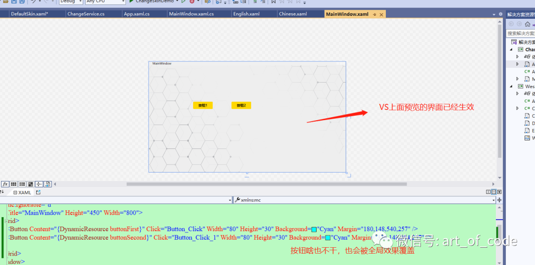 39、按钮1走一波,皮肤背景换回白色,按钮背景换回金色。由于也设置了语言切换,所以语言也跟着更新了。