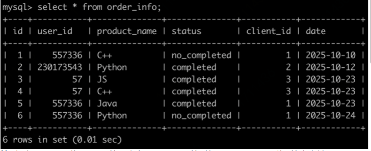 第1行表示user_id为557336的用户在2025-10-10的时候使用了client_id为1的客户端下了C++课程的订单,但是状态为没有购买成功。