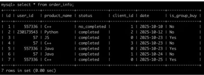 最后1行表示user_id为557336的用户在2025-10-25的时候使用了下了C++课程的拼团(is_group_buy为Yes)订单,拼团不统计客户端,所以client_id所以为0,状态为购买成功。