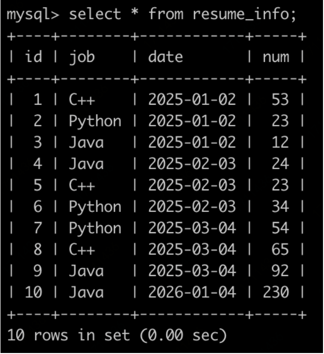 最后1行表示,在2026年1月4号,Java岗位收到了230封简历