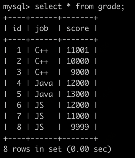 第8行表示用户id为8的用户选择了JS岗位并且考了9999分