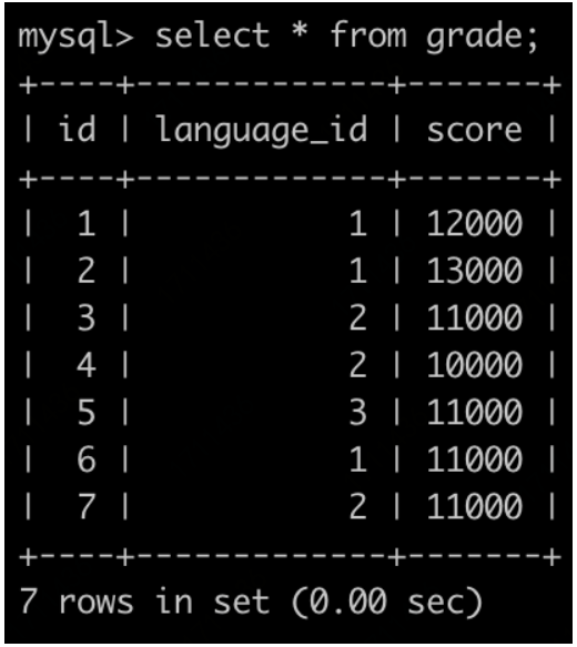 第7行表示用户id为7的选择了language_id为2岗位的最后考试完的分数为11000,