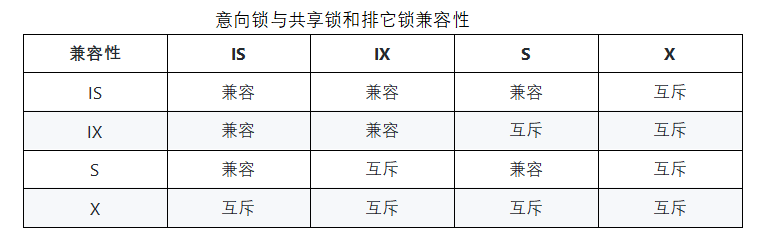通过上述图表看到意向锁之间是兼容的,只有意向共享锁和普通共享锁是兼容的。