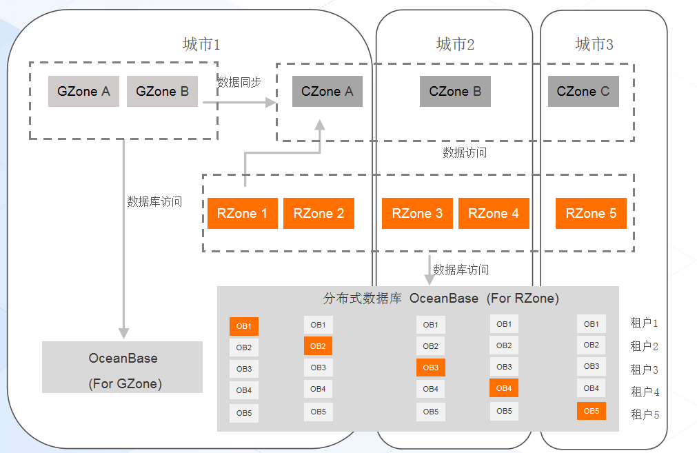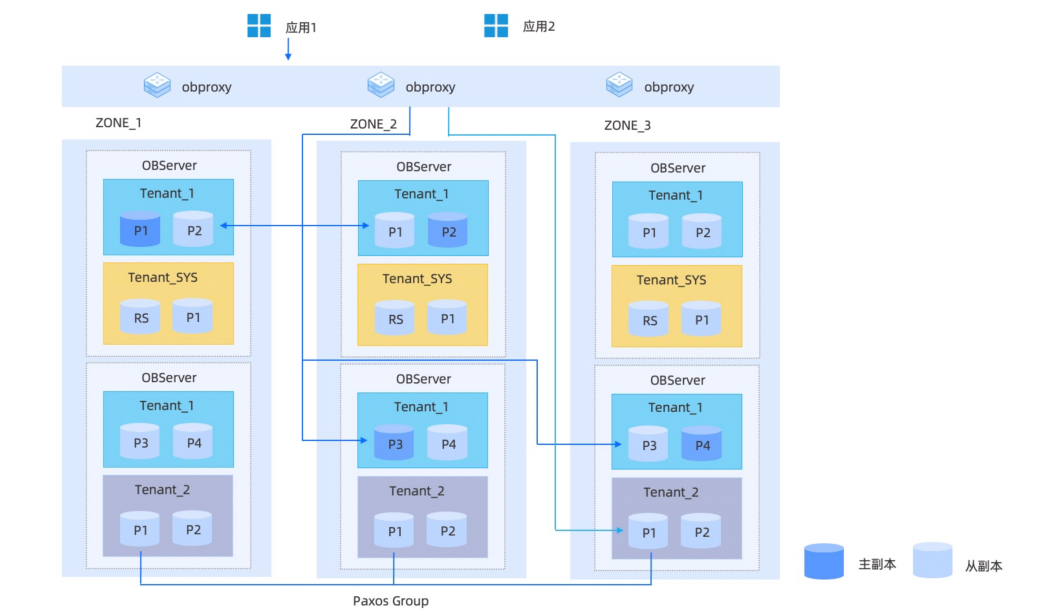 - 多副本:部署为三个或五个Zone,每个Zone由多个数据库节点(OBServer)组成;