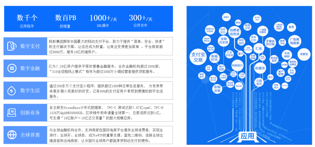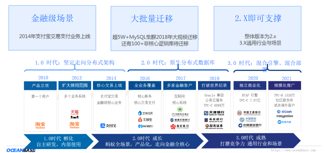 集群级别追加zone,数据自动进行复制,自动选出Leader,可提升集群容灾能力水平(容忍更多副本故障)、可提升集群计算/负载能力,集群读吞吐量提升百分比≈新增节点CPU核数/现有集群CPU总核数。OceanBase 采用线性设计,三副本、五副本,多加两个中心,五副本架构就可以保证每个区域的机房是不会宕机,蚂蚁支付宝内部是三地五中心的架构。OceanBase 和所有数据库都不太一样的地方,是数据库内实现多租户隔离的。带来的好处一是大集群,将长尾应用的多实例MySQL/Oracle统一进行管理,有效提高资源密度,消除存储碎片。 二是多租户实现数据库内核级虚拟化,满足数据安全隔离的同时,提供基于业务画像的可伸缩计算资源,做到内核级虚拟化和CPU内存隔离,即将发布的 OceanBase 4.0做到IOPS隔离,全资源池化与弹性化。图为OCP的实际应用图,通过OCP管理平台管理A业务和B业务的库相对应的资源池,在平台上简单操作或者设定预先的阈值即可达到自动弹性扩缩容。OceanBase 根据业务特性对数据分区,可以通过PG(Partition Group进行最佳业务模型优化),把选择交给了业务与DBA;内涵全能型副本,只读副本等四种类型副本满足数据安全/性能伸缩/可用性/成本等各方面需求,业务根据需求自由选择。LSM存储引擎,分为基线数据+增量数据两部分。对比MySQL能减少三分之二的存储成本;也可以选择其他压缩算法,根据业务场景的数据解压缩速率要求,OceanBase 把所有的选择权交给用户,可以实现极致场景下的极致性能。OceanBase 4.x时代实现了从5%的分布式场景扩展到了100%的HTAP场景,特性即可分布式也可单机版小型化,最小规格是4C8G,和MySQL的TP性能一致,AP和存储成本比MySQL有极大优势。这样带来的好处是业务量小的时候可以用OB的小型化单机部署;随着业务量扩张,只要增加机器,就可以平滑过渡成分布式,OLTP场景或HTAP场景都可以使用,一次性解决"加和拆"的所有痛点!同事新一版的 OceanBase 的4.X RTO基于全新的选举与探活机制由30秒优化到8秒。功能完善方面,OB4.x做为分布式数据库具备原生主备库能力,类似MySQL的主从,可以解决多机房多云跨地部署的延时场景。OceanBase 带来的是HTAP全场景覆盖,所有的核心系统,无论是大中小型企业都可以开箱即用,成本骤减,同时管理运维用OCP就足够了。性能提升方面,OceanBase 4.0读写相比之前3.x提升了50%,如果单纯看写,提升了大概80%,对日志流也做了极大的优化。易用性方面,增加了全链路追踪能力,可以帮助业务迅速定位问题根因,支持粒度到SESSION级别诊断。支付宝是国内早期大规模使用MySQL的企业,当时“加和拆”是最常用的手段,刚开始加机器,数据量大了就得拆,拆了以后交易库和支付库还要做主备切换、数据验证,痛点很多。支付宝巅峰时候大概十万套MySQL集群,使用极不方面。现有架构MySQL老牌OLTP,技术熟悉,稳定可靠,有二十多年历史,InnoDB存储引擎,生态也很稳定,场景也丰富。但这套架构痛点很多,或者说MySQL本身很脆弱,主备集群方面会切换丢失,老牌技术MHAGTID模式也有源码缺陷,MGR网络环境抖动,同城和异地容灾切换数据丢失;分库分表上,基于中间件入侵DBA,不基于中间件入侵业务,人力成本投入非常高。4.数据库内多租户隔离,一个大部门一个数据库集群就可以解决资源冗余问题;5.Partition分区,不造成业务入侵解决分库分表问题;OceanBase 出生就具备了这些特性,解决痛点同时保证核心场景稳定运行。