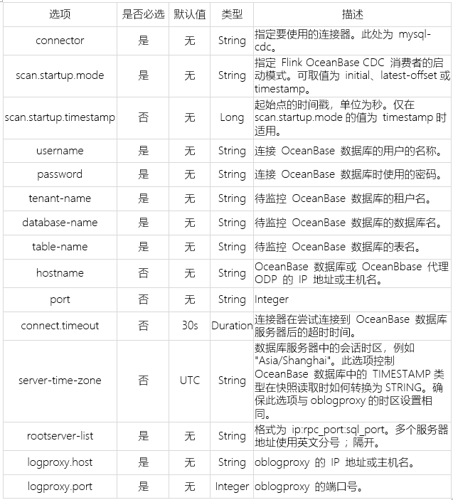 配置选项 scan.startup.mode 指定 OceanBase CDC 连接器的启动模式。可用取值包括: