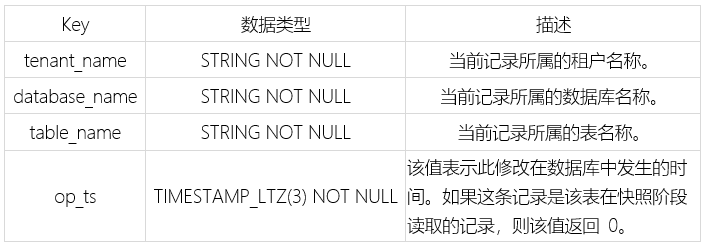 CREATE TABLE products (tenant_name STRING METADATA FROM 'tenant_name' VIRTUAL,db_name STRING METADATA FROM 'database_name' VIRTUAL,table_name STRING METADATA FROM 'table_name' VIRTUAL,operation_ts TIMESTAMP_LTZ(3) METADATA FROM 'op_ts' VIRTUAL,order_id INT,order_date TIMESTAMP(0),customer_name STRING,price DECIMAL(10, 5),product_id INT,order_status BOOLEAN,PRIMARY KEY(order_id) NOT ENFORCED) WITH ('connector' = 'oceanbase-cdc','scan.startup.mode' = 'initial','username' = 'user@test_tenant','password' = 'pswd','tenant-name' = 'test_tenant','database-name' = 'test_db','table-name' = 'orders','hostname' = '127.0.0.1','port' = '2881','rootserver-list' = '127.0.0.1:2882:2881','logproxy.host' = '127.0.0.1','logproxy.port' = '2983');