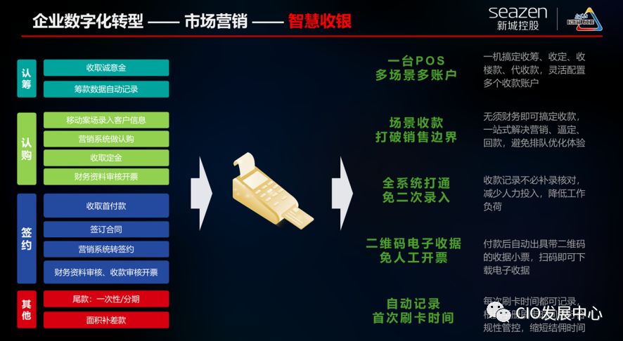 智慧收银:案场的智慧收银已经在很多公司实现全面应用。通过定制化的智能POS机,将线下的收银动作与售楼系统打通。既加强了案场收银的风控,又大幅减轻了现场财务人员的工作量,甚至可以完全取消案场结算员的设置。仅从人力成本上,就能够带来非常大的效益。